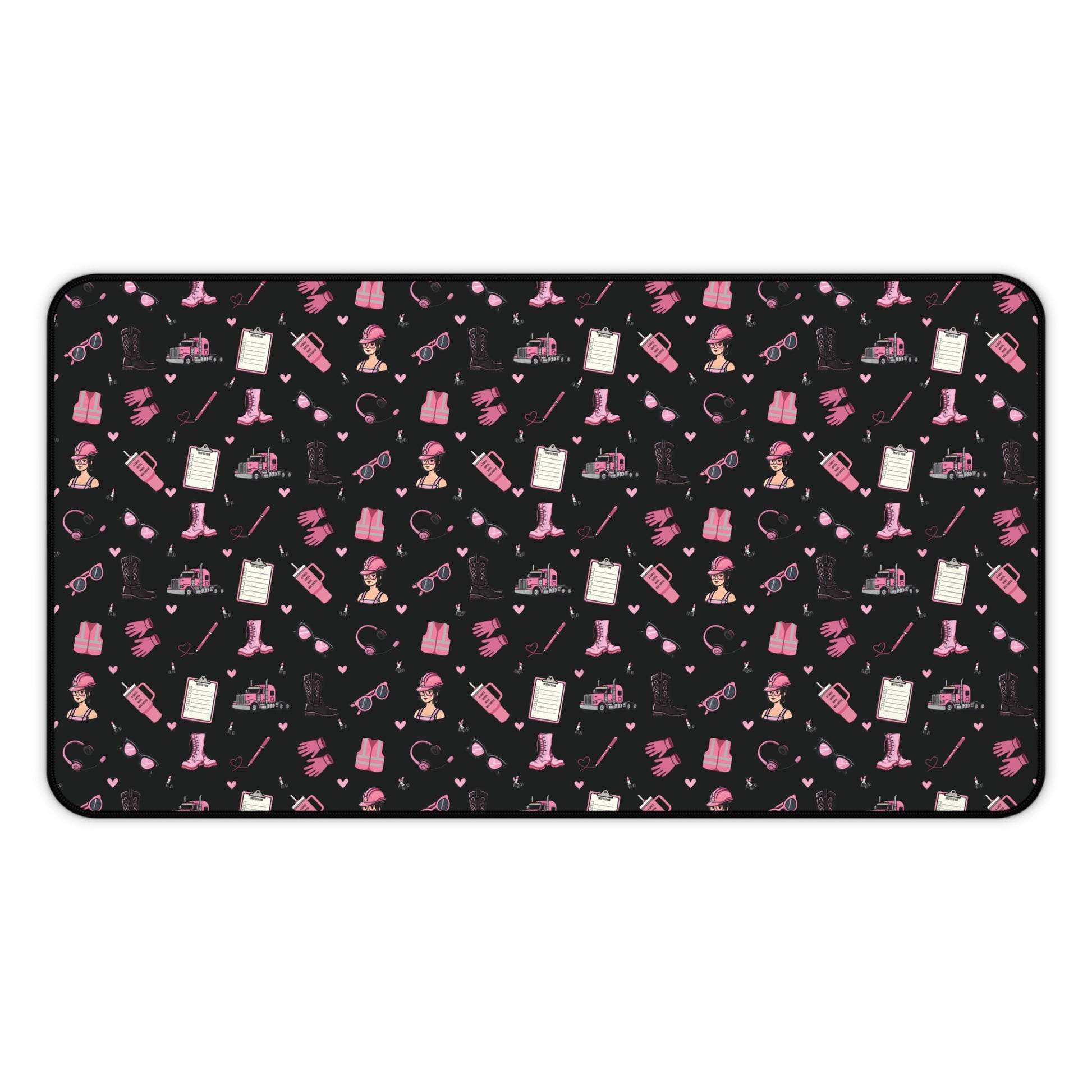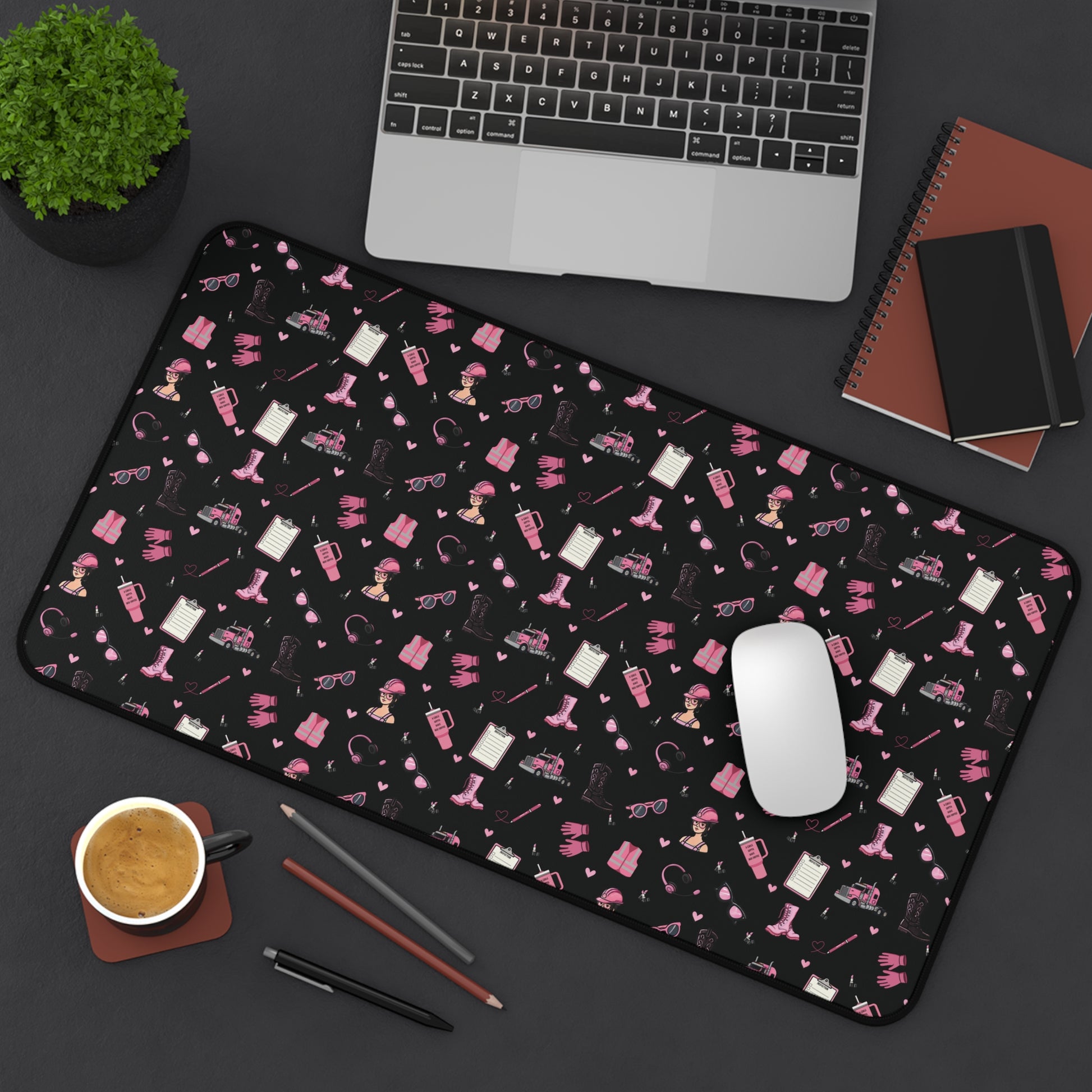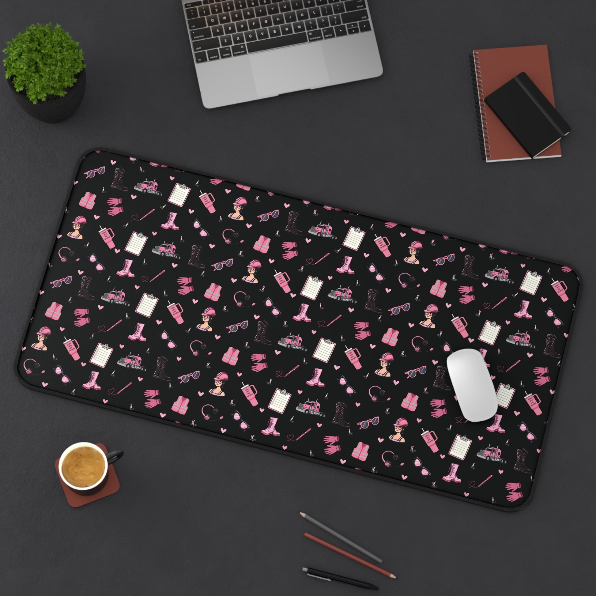 Upgrade your workspace with this empowering Diesel Diva mouse pad, designed especially for women in trucking and logistics. Featuring a bold and feminine trucking-inspired print in pink and black, it showcases playful illustrations of semi-trucks, safety gear, work boots, headsets, and everyday essentials—arranged in a fun repeating pattern that adds personality and motivation to your daily routine.