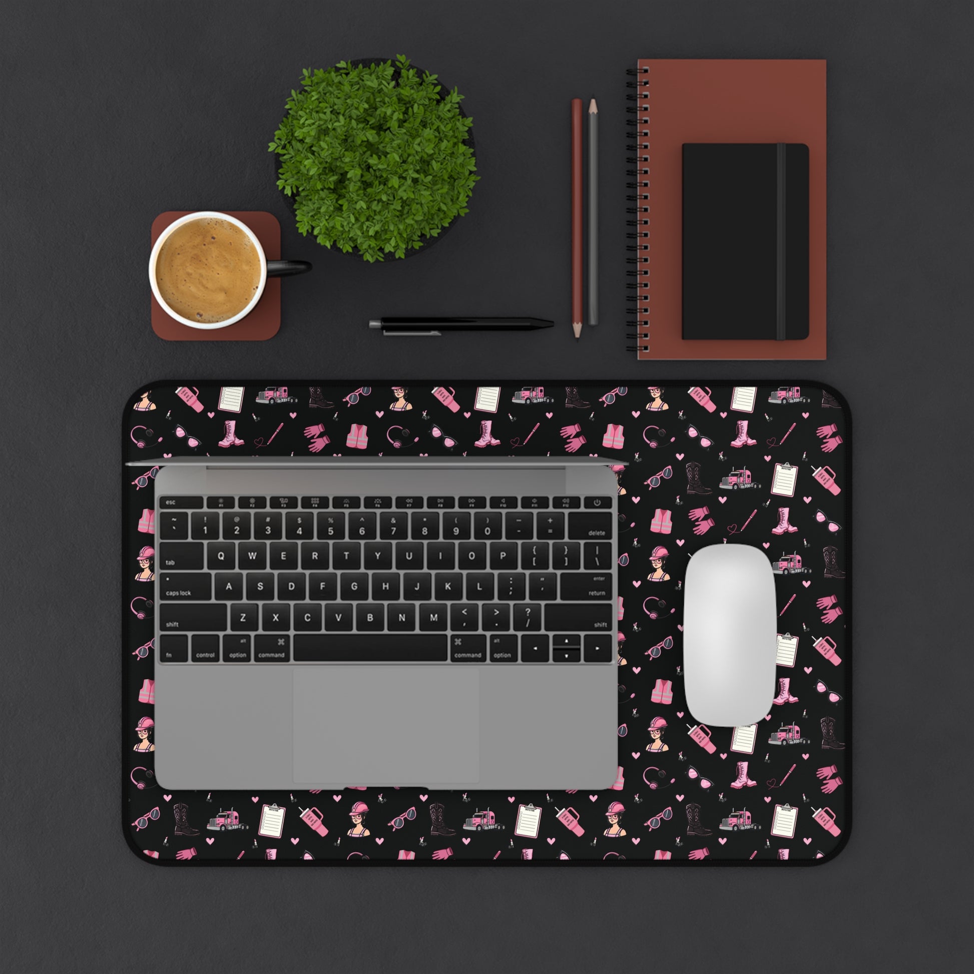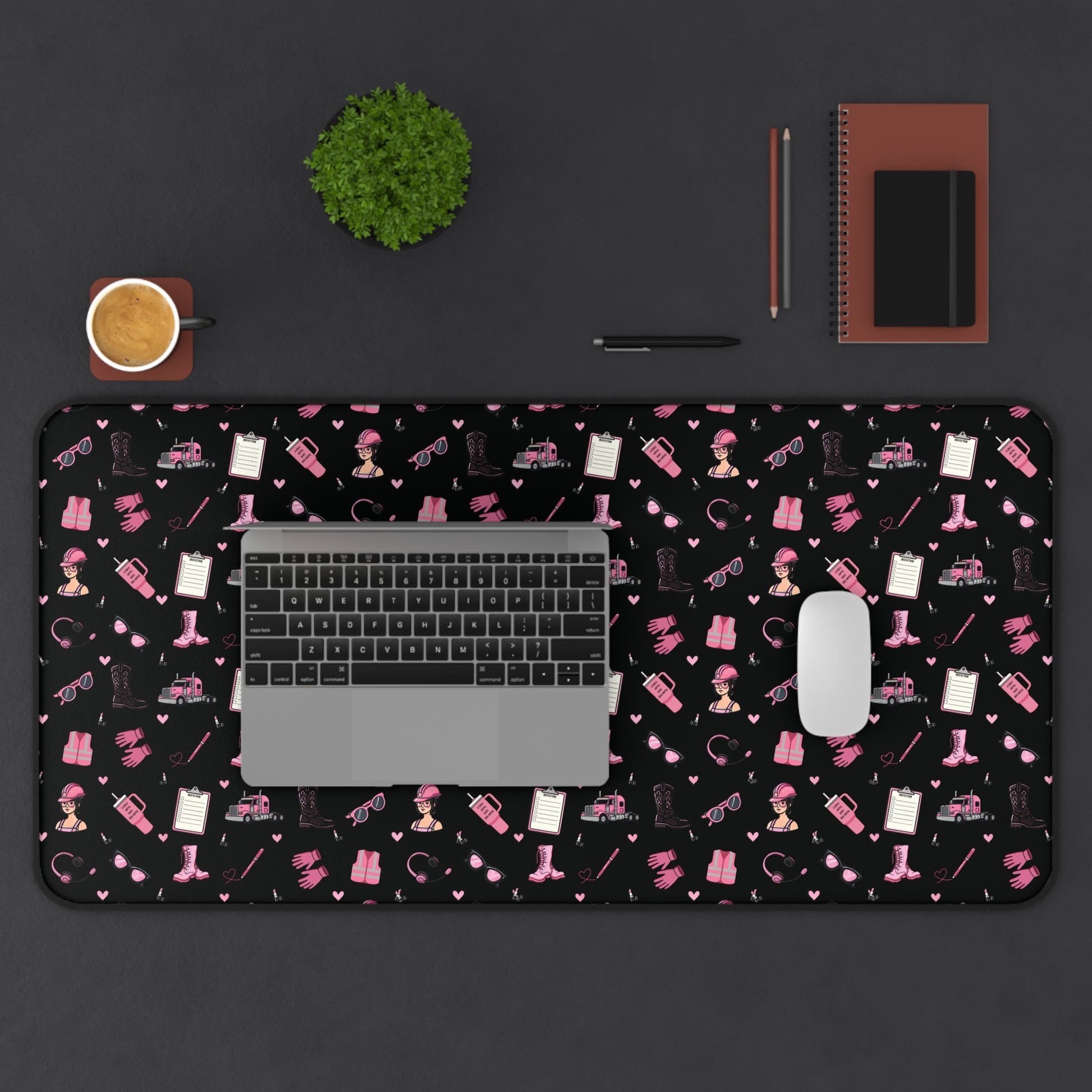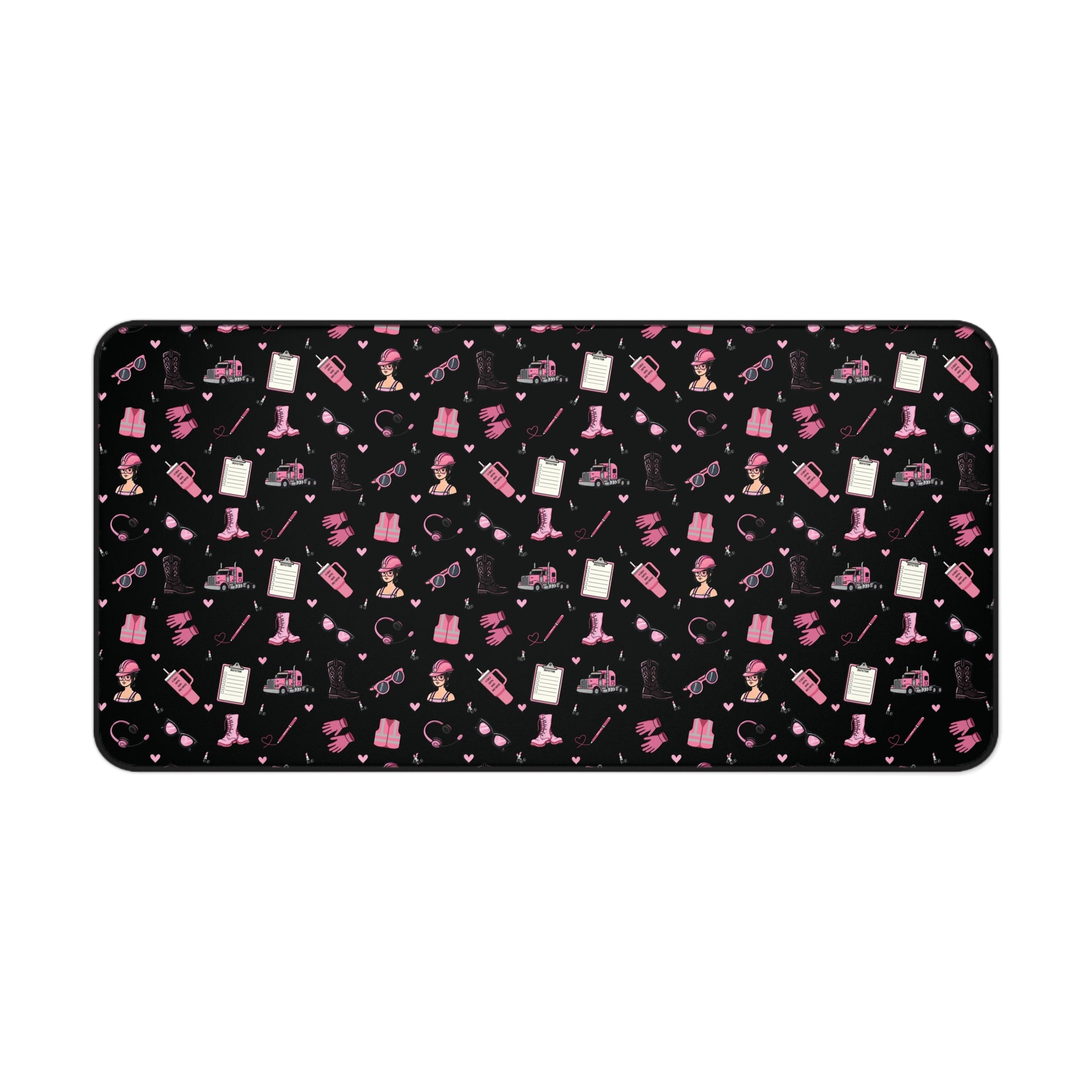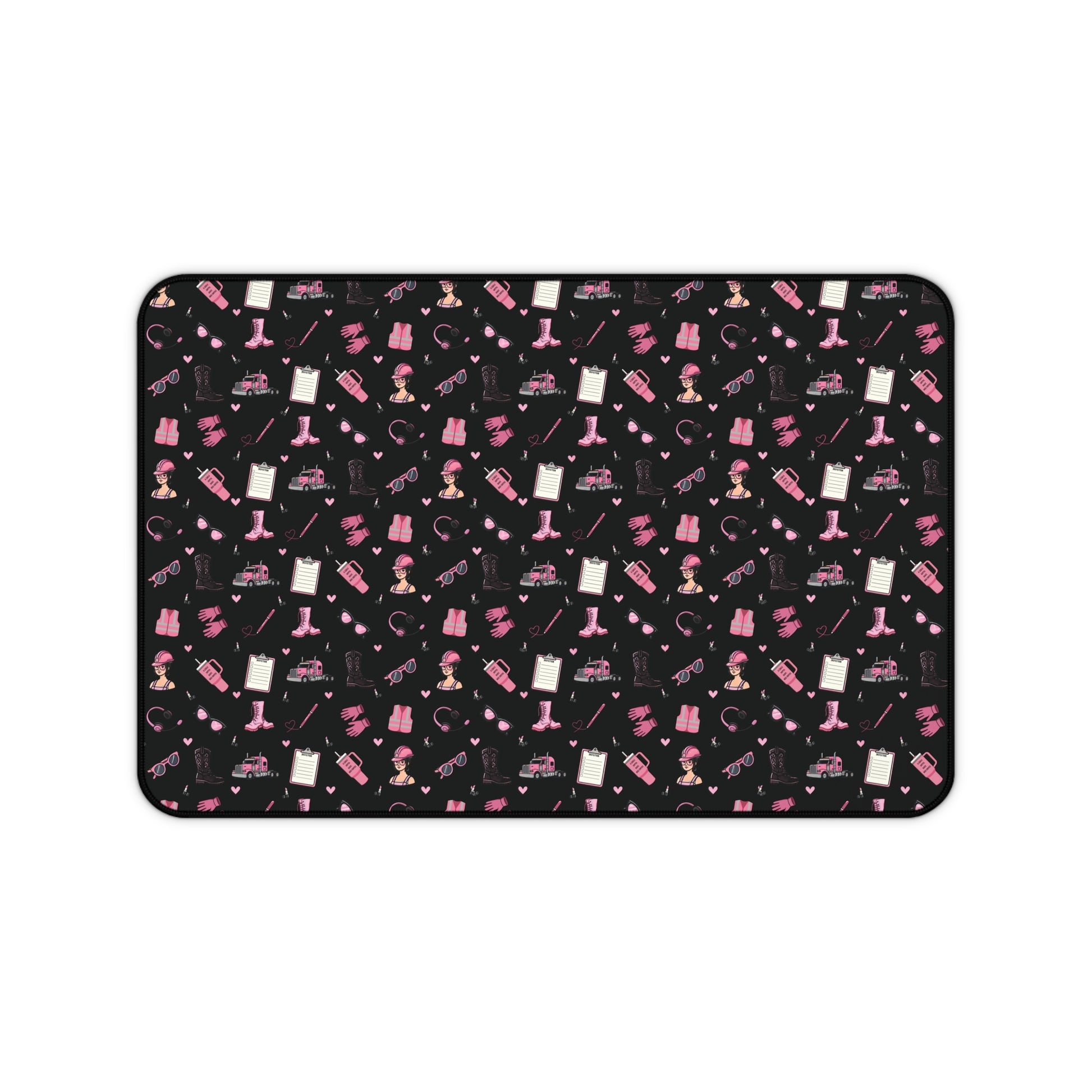 Upgrade your workspace with this empowering Diesel Diva mouse pad, designed especially for women in trucking and logistics. Featuring a bold and feminine trucking-inspired print in pink and black, it showcases playful illustrations of semi-trucks, safety gear, work boots, headsets, and everyday essentials—arranged in a fun repeating pattern that adds personality and motivation to your daily routine.