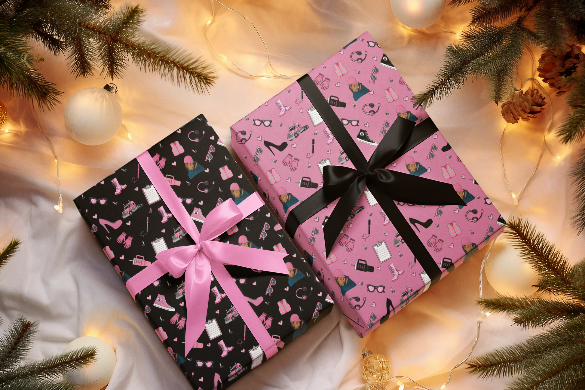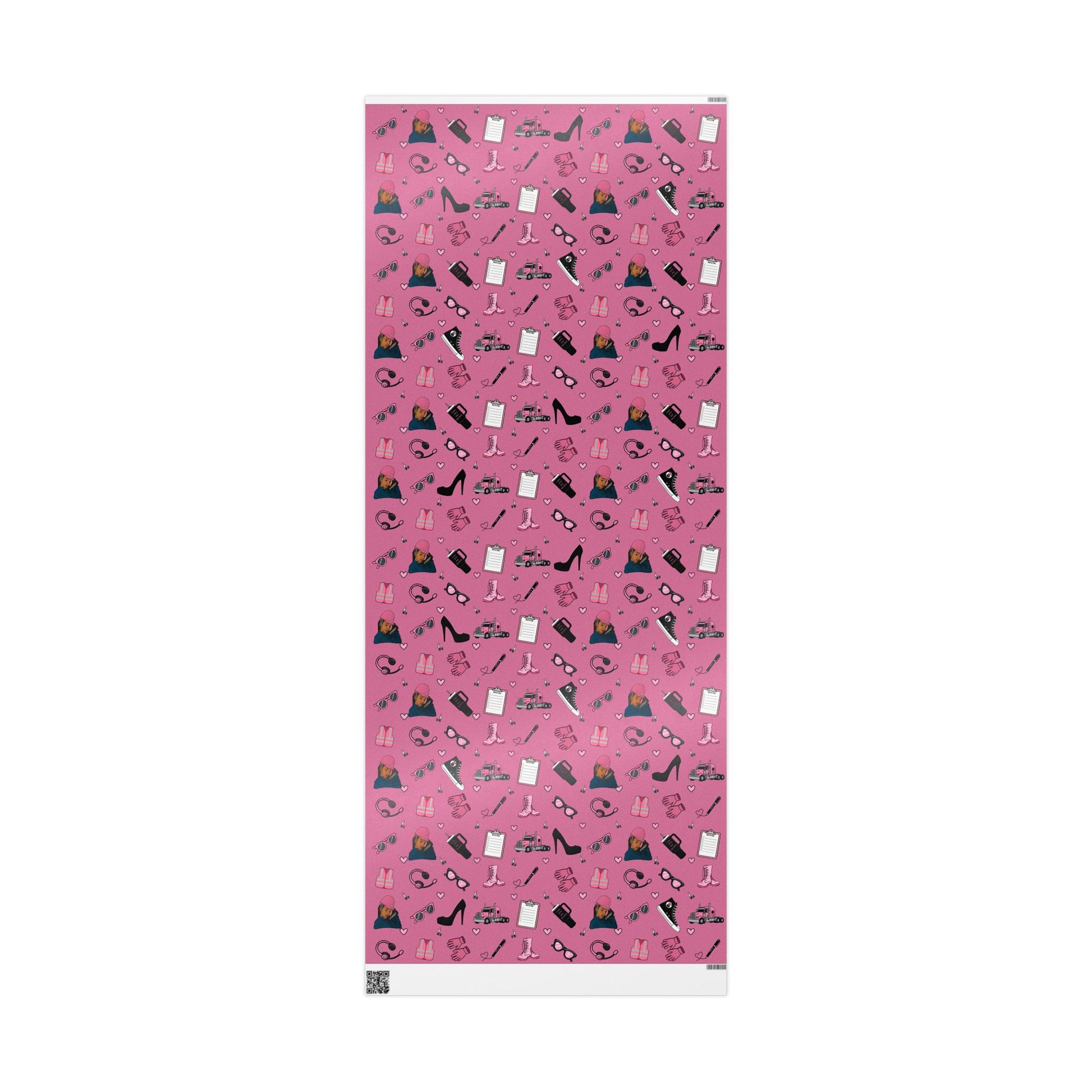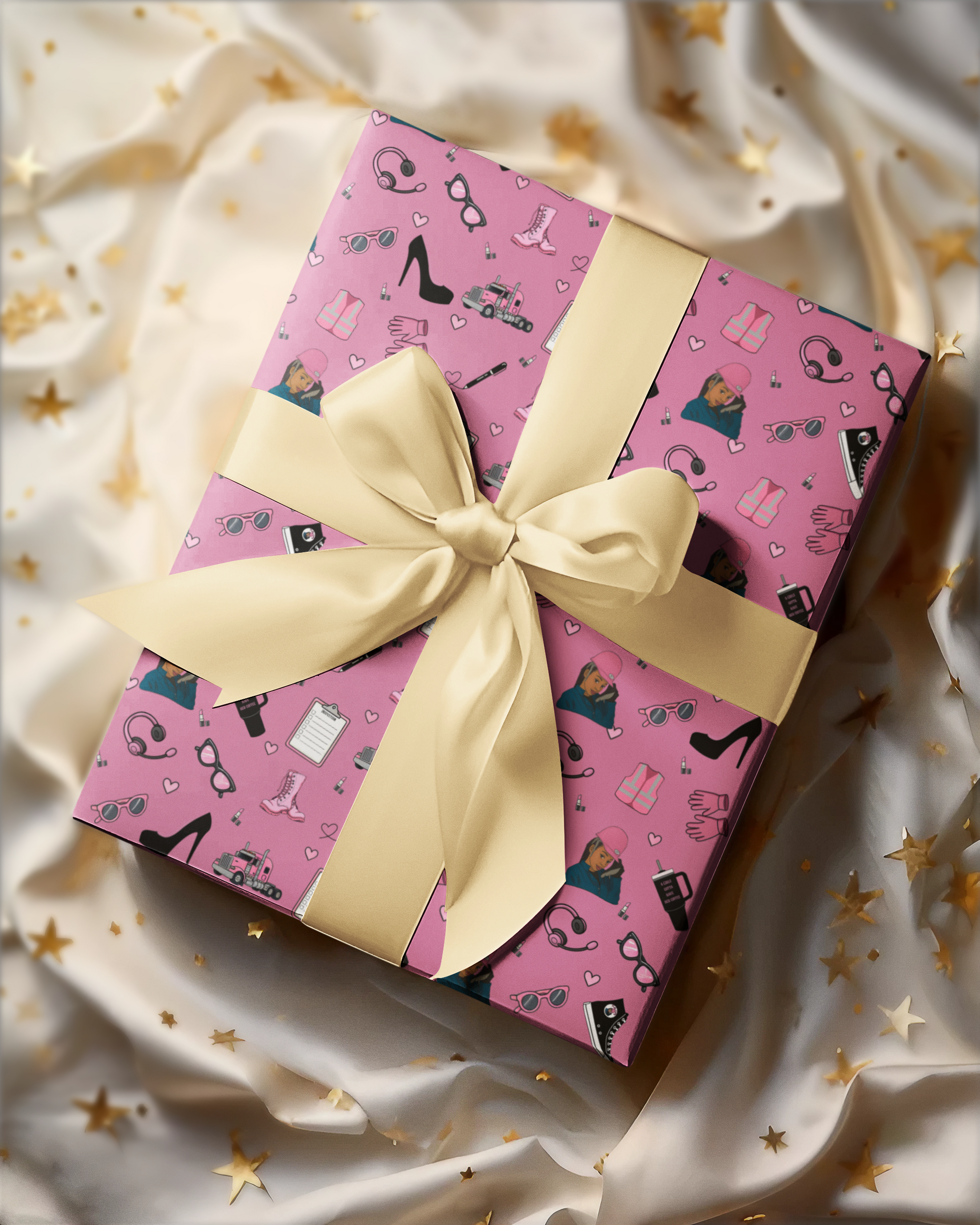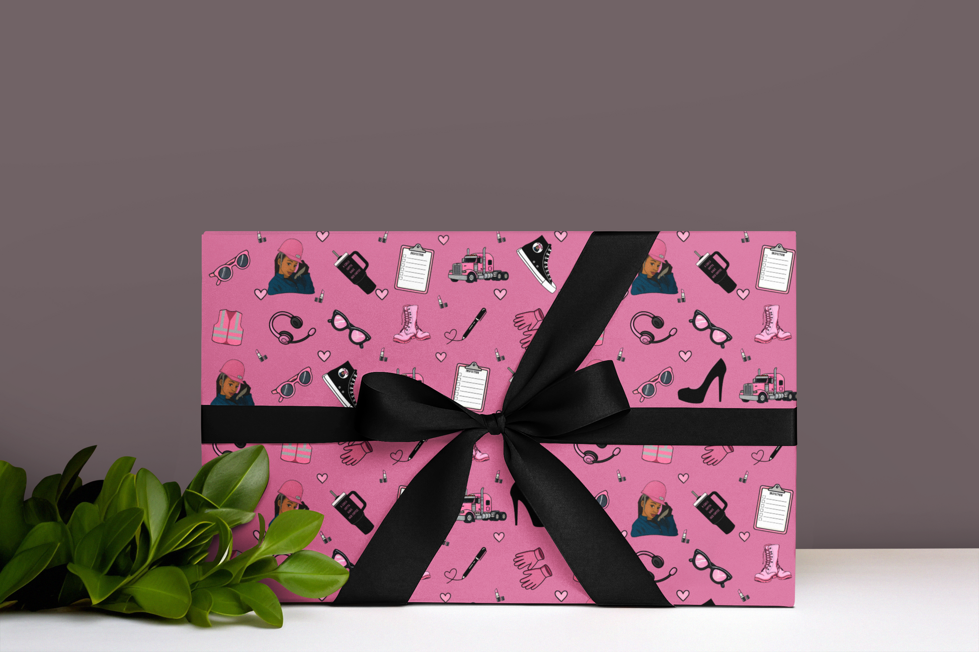 Wrap your gifts with style and personality! This unique wrapping paper features a fun, feminine trucking theme designed especially for women in trucking. With bold, cartoon-style illustrations of pink semi-trucks, safety vests, hard hats, sunglasses, boots, gloves, clipboards, water tumbler, lipstick, and little hearts, this design is both playful and empowering.