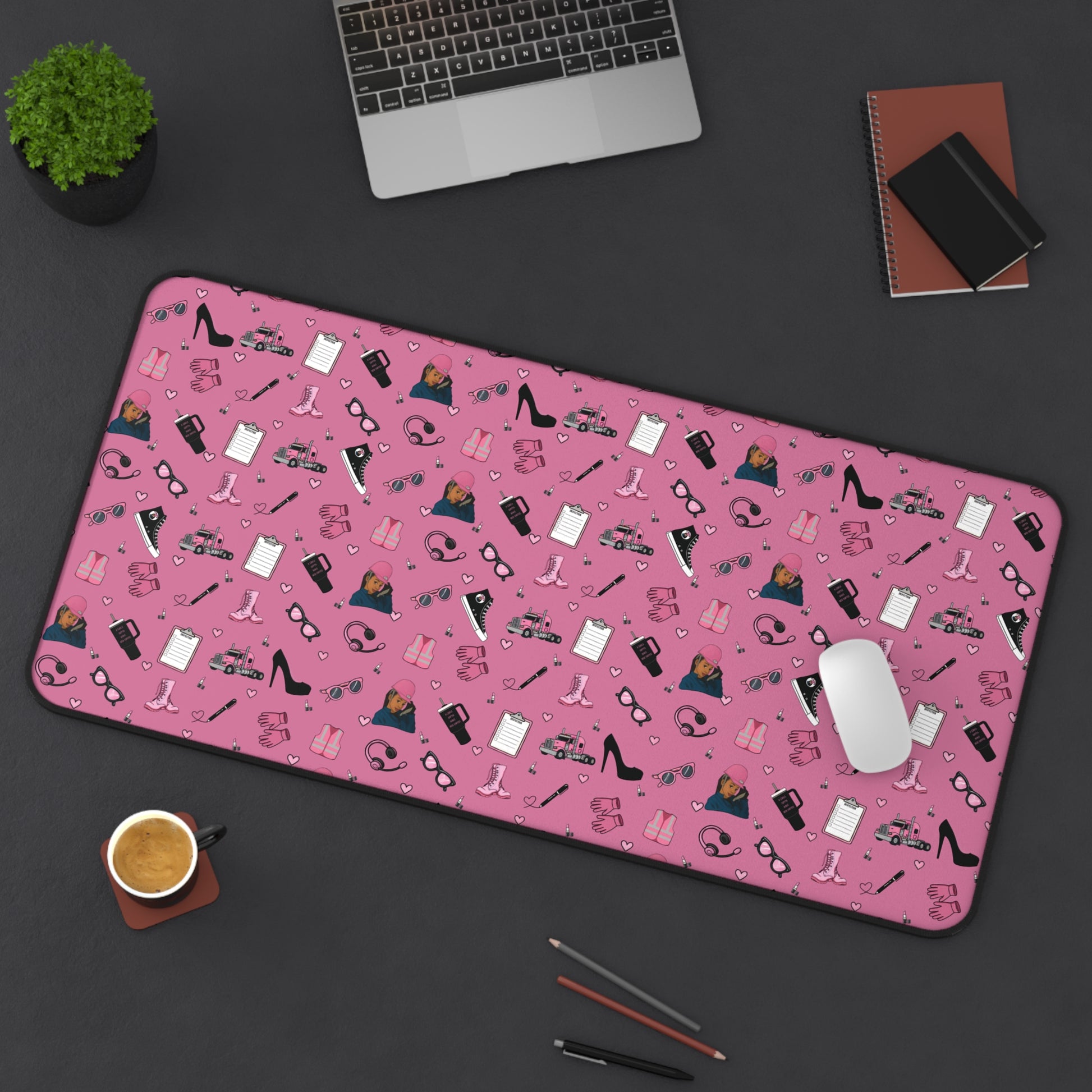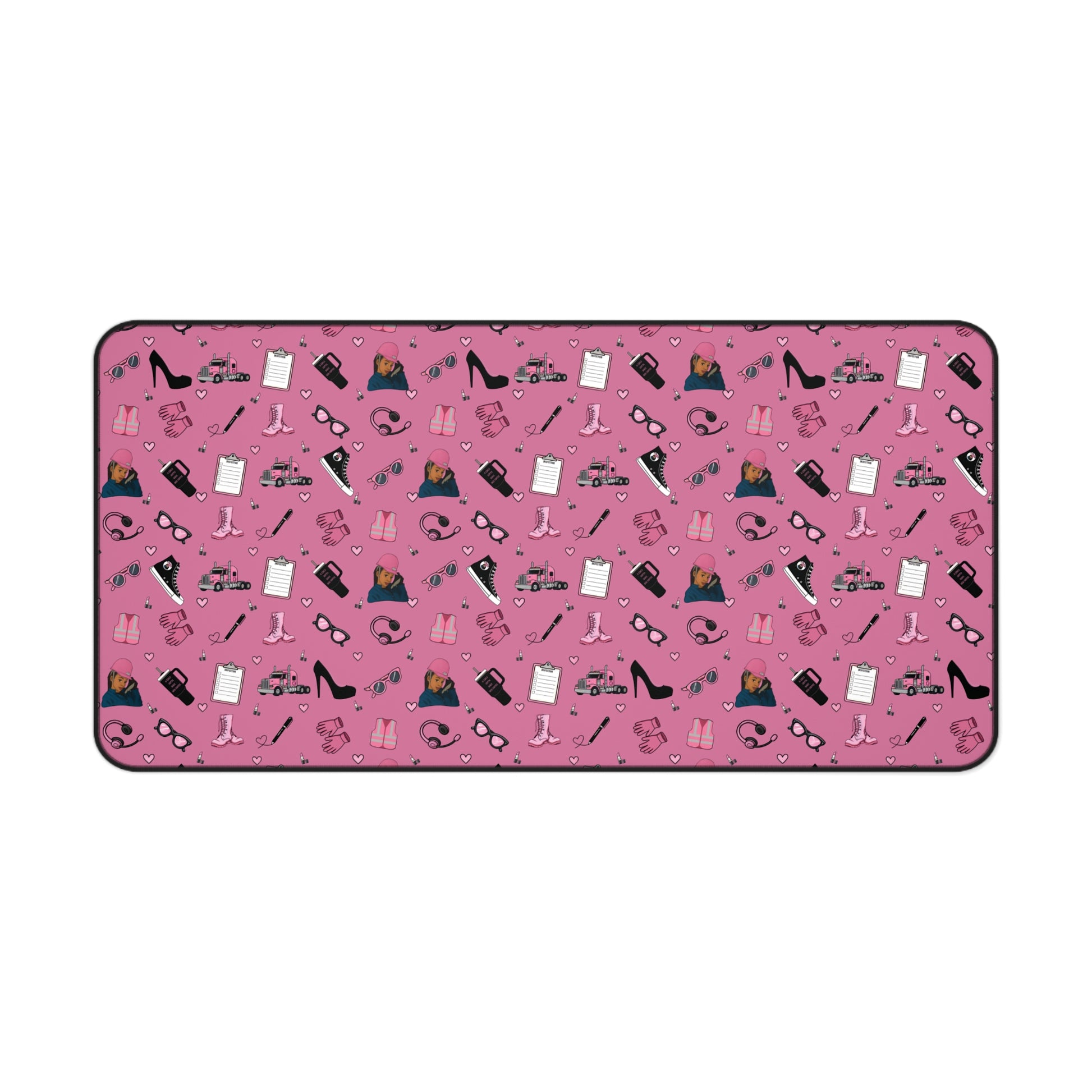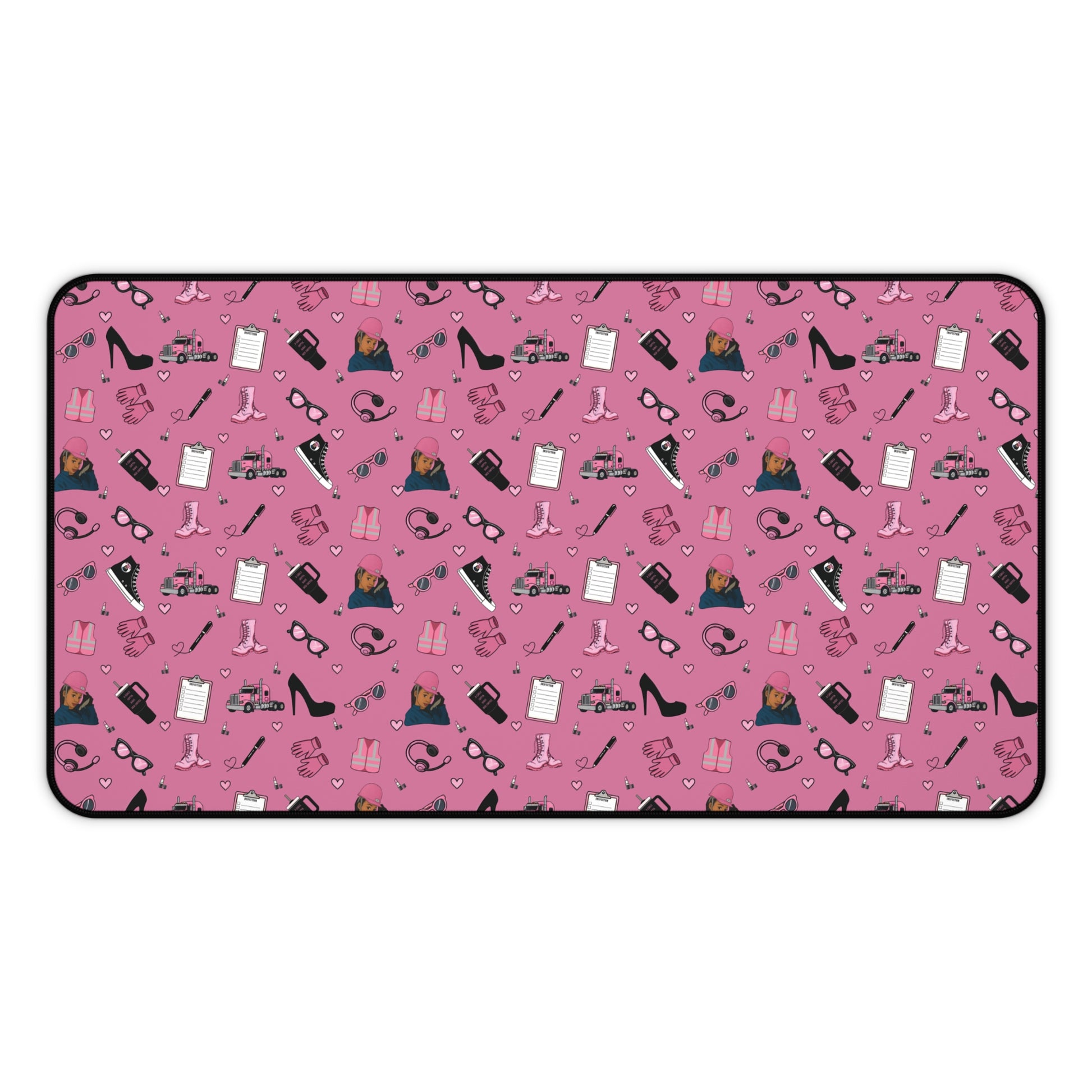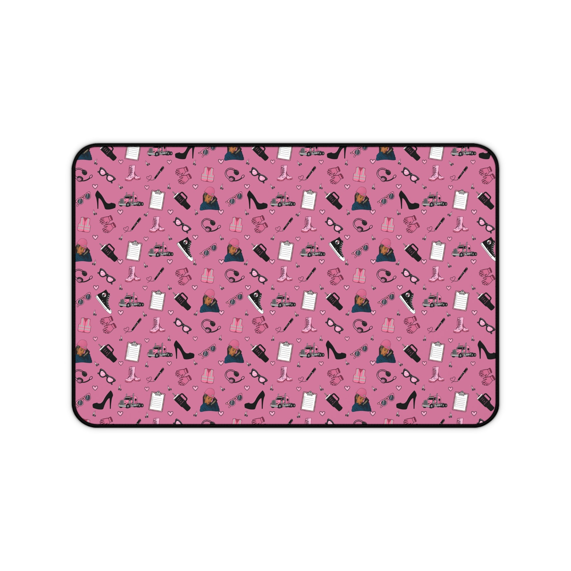 Upgrade your workspace with this empowering Diesel Diva mouse pad, designed especially for women in trucking and logistics. Featuring a bold and feminine trucking-inspired print in pink and black, it showcases playful illustrations of semi-trucks, safety gear, work boots, headsets, and everyday essentials—arranged in a fun repeating pattern that adds personality and motivation to your daily routine.
