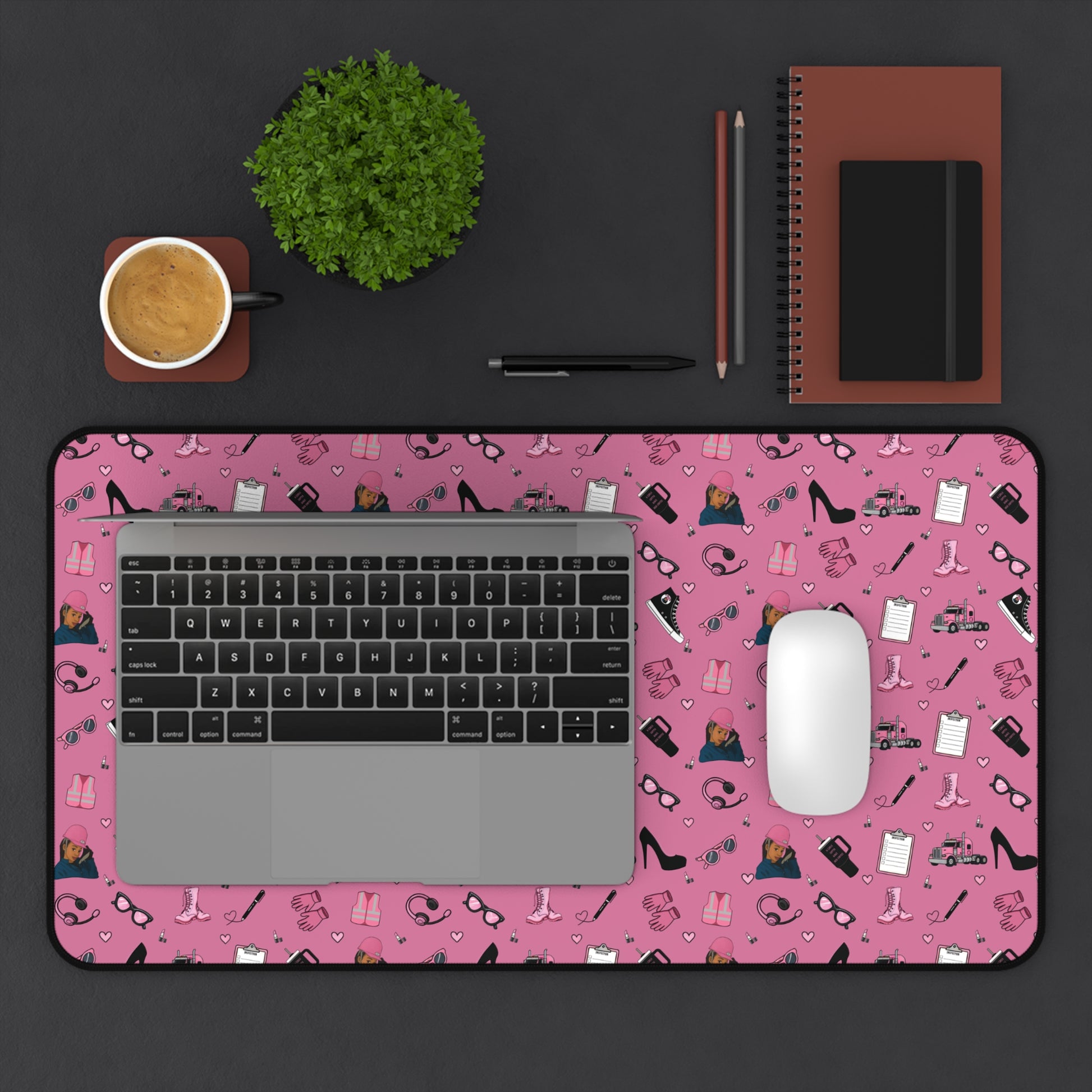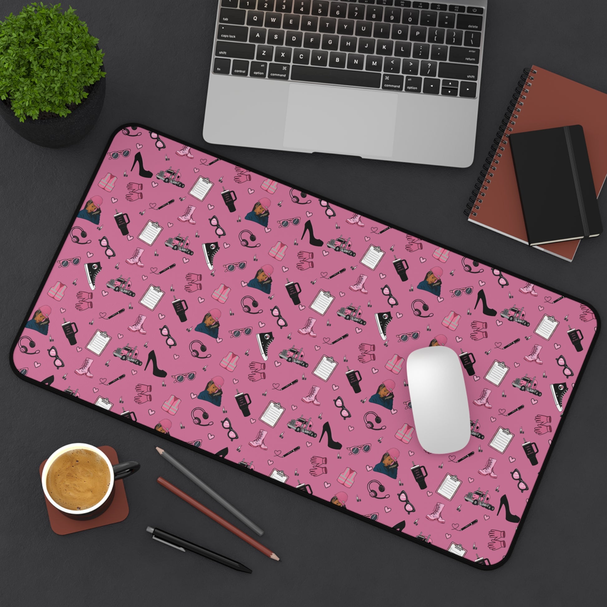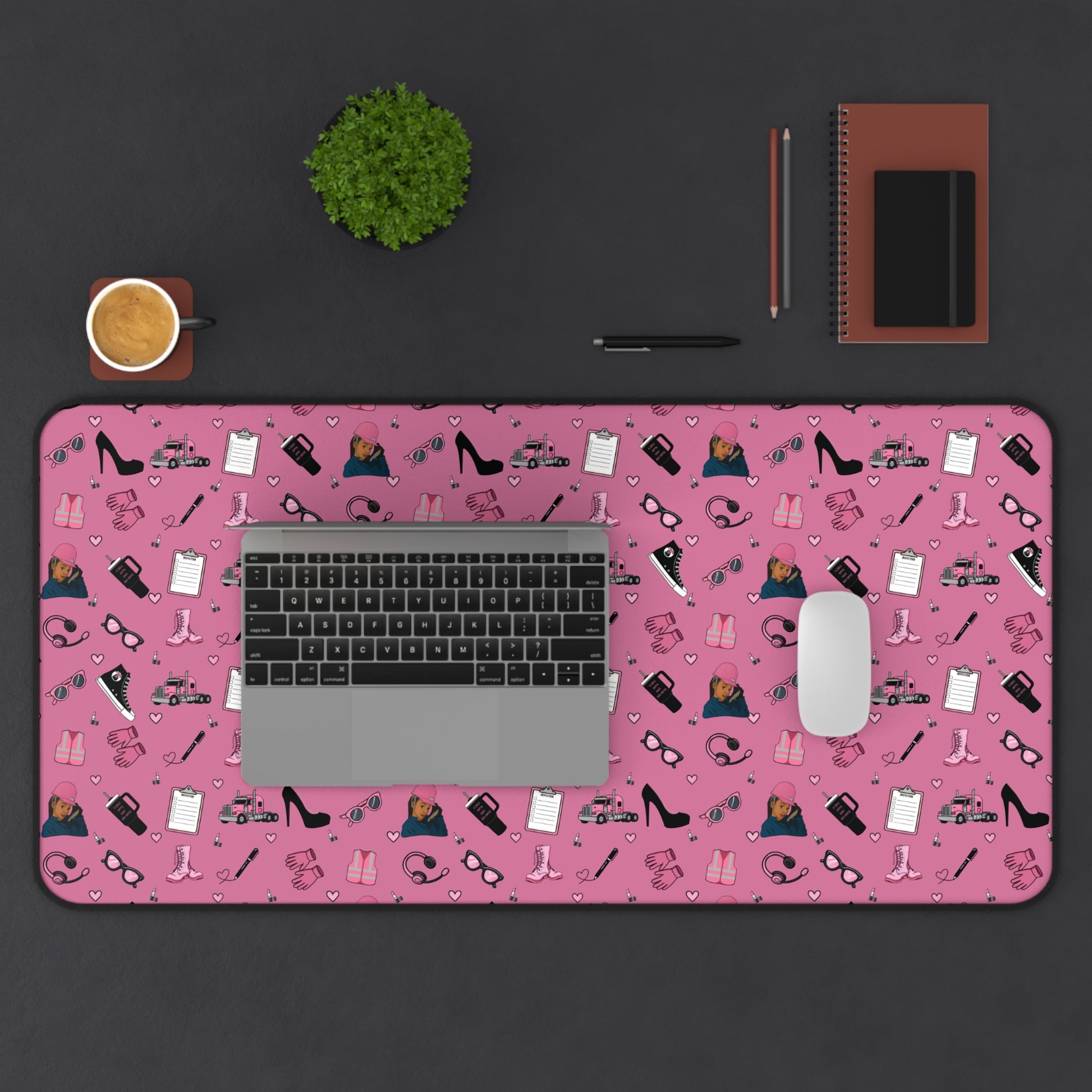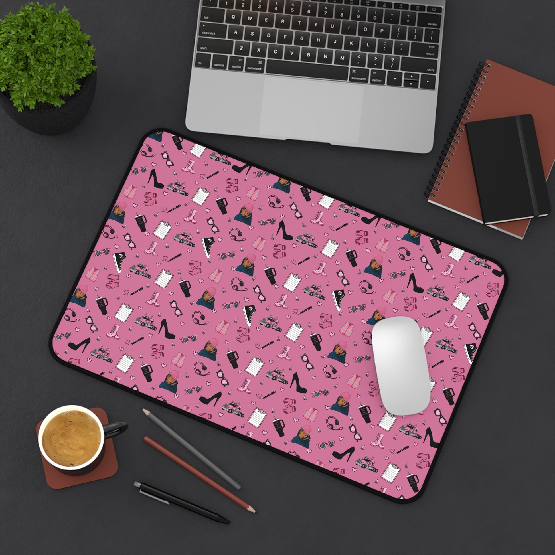 Upgrade your workspace with this empowering Diesel Diva mouse pad, designed especially for women in trucking and logistics. Featuring a bold and feminine trucking-inspired print in pink and black, it showcases playful illustrations of semi-trucks, safety gear, work boots, headsets, and everyday essentials—arranged in a fun repeating pattern that adds personality and motivation to your daily routine.