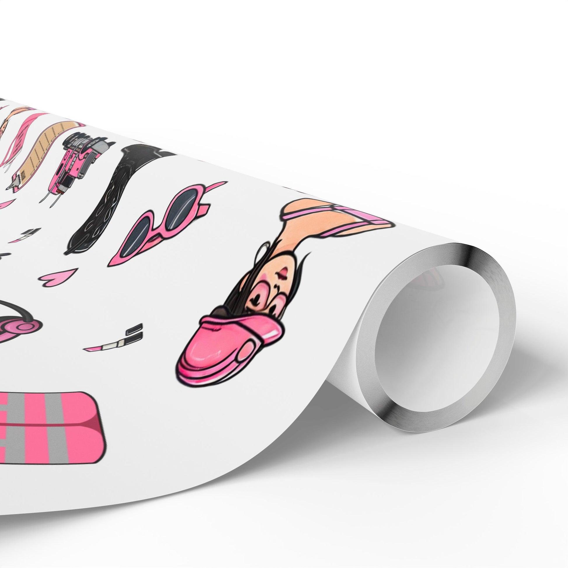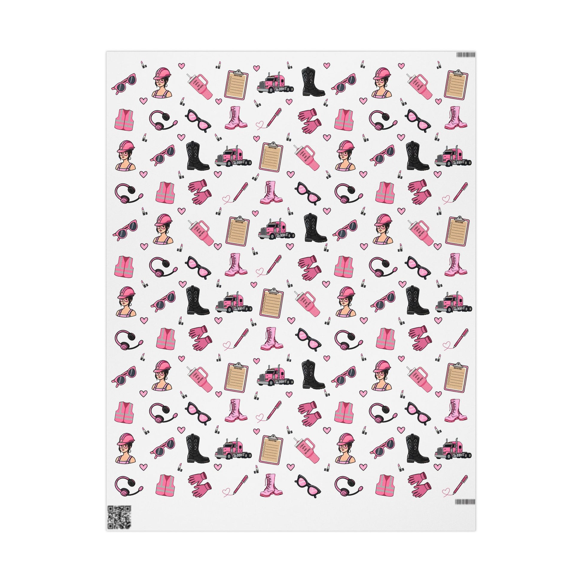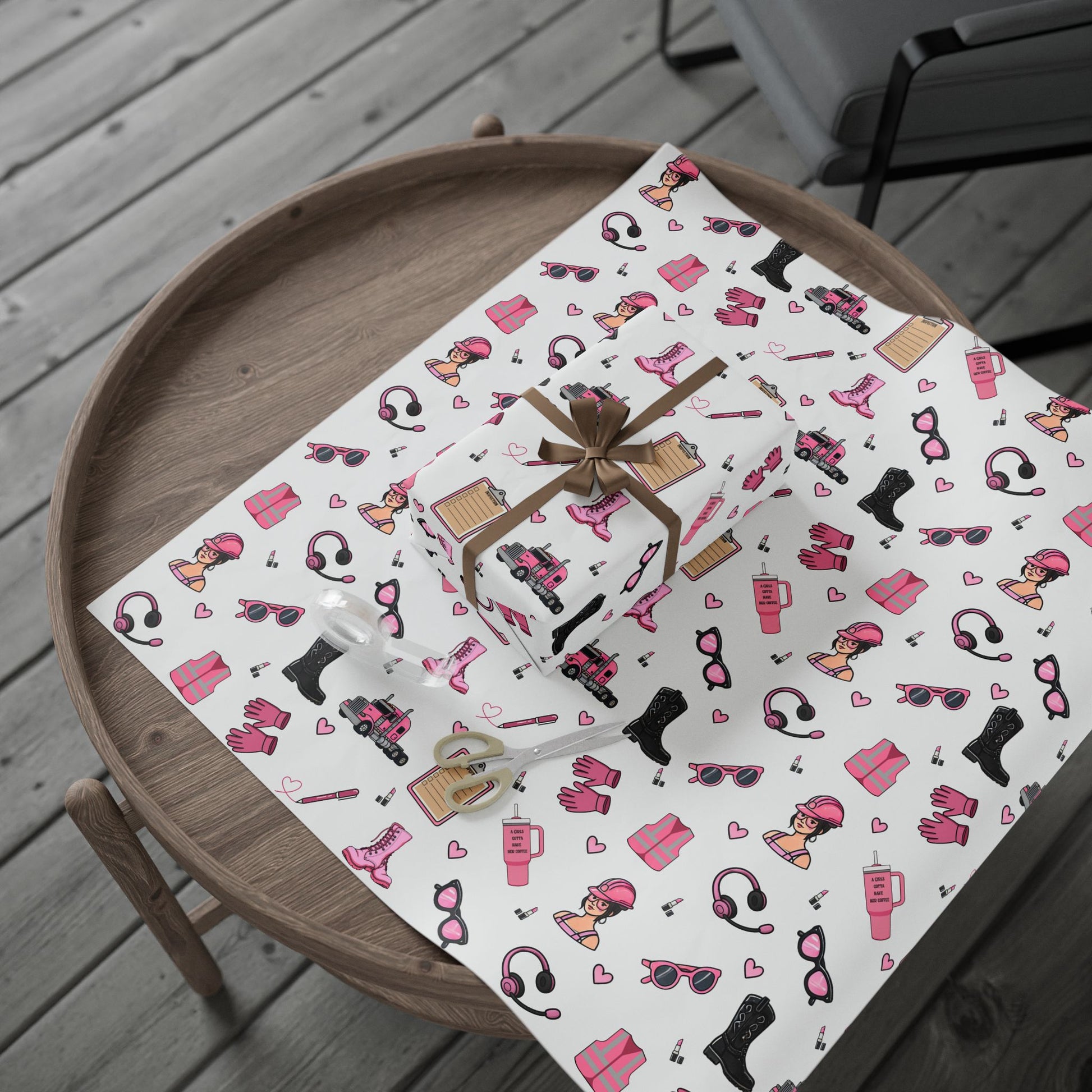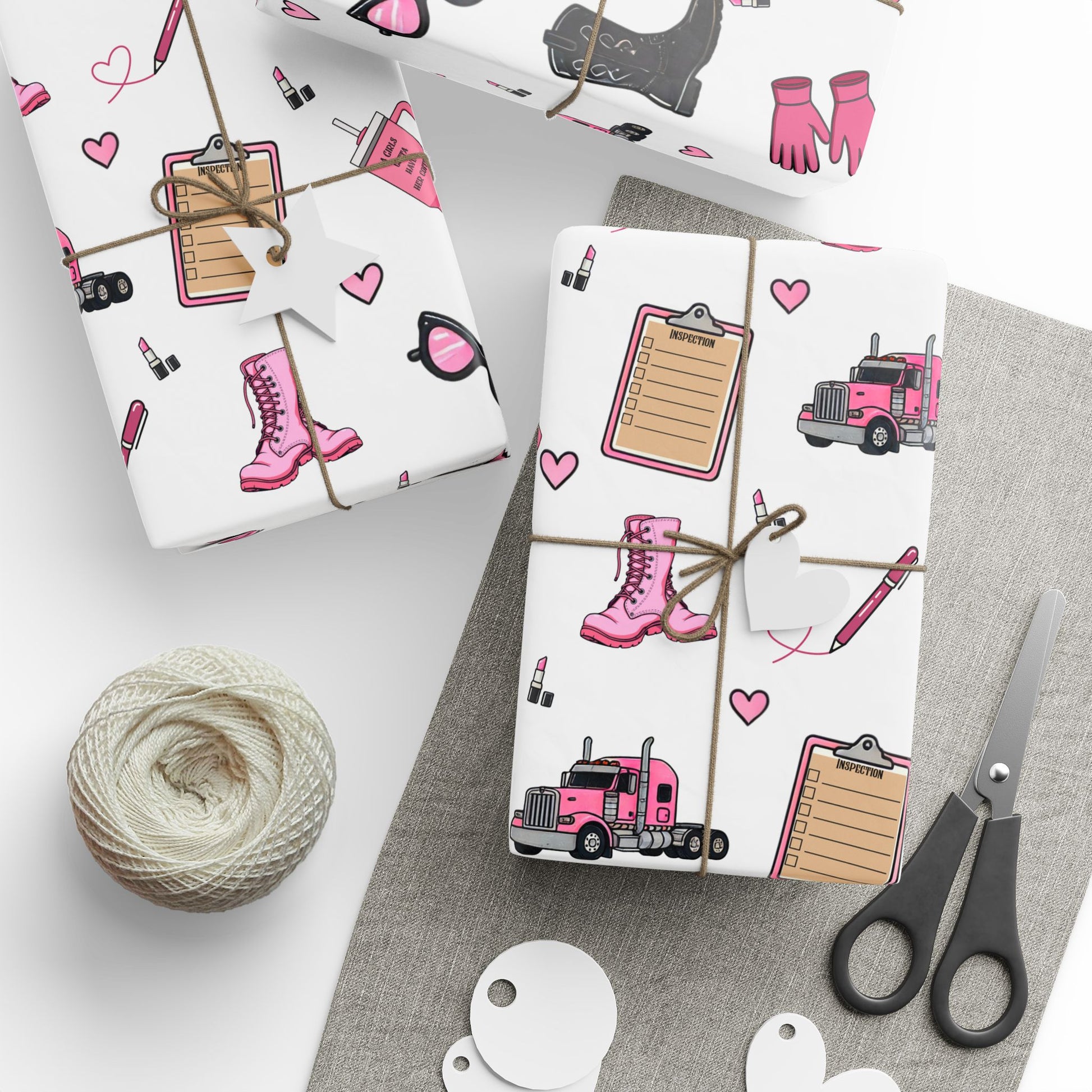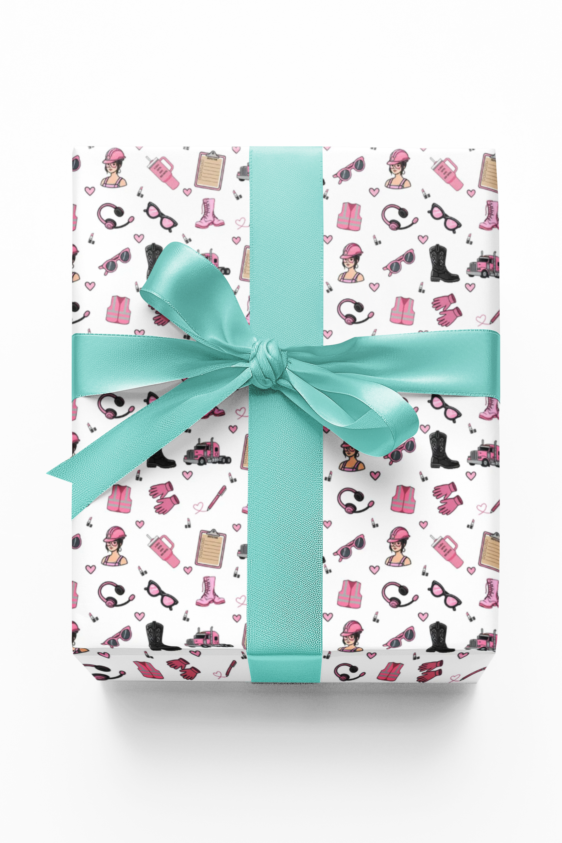 Wrap your gifts with style and personality! This unique wrapping paper features a fun, feminine trucking theme designed especially for women in trucking. With bold, cartoon-style illustrations of pink semi-trucks, safety vests, hard hats, sunglasses, boots, gloves, clipboards, water tumbler, lipstick, and little hearts, this design is both playful and empowering.
